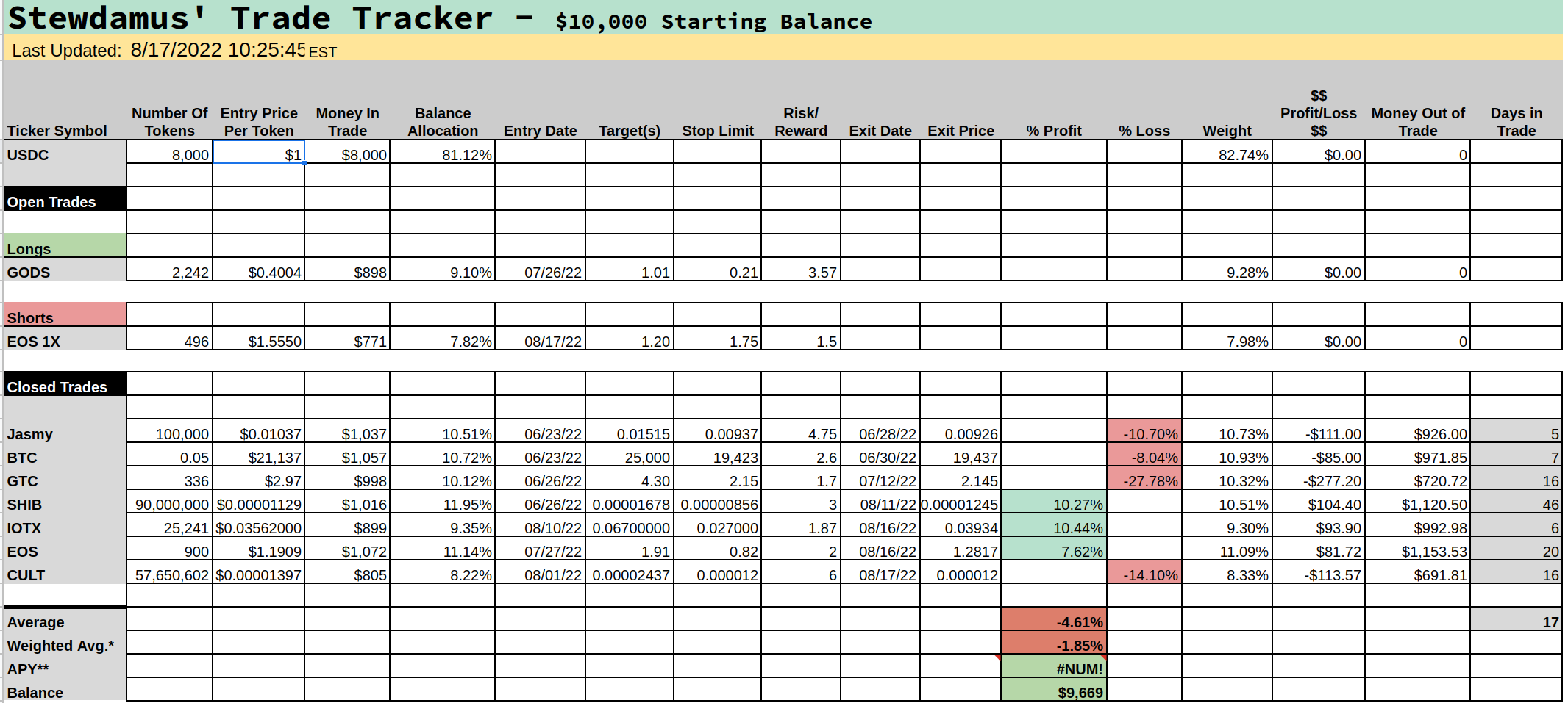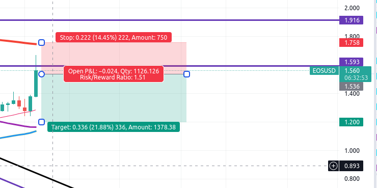 I have entered my first short trade for our $10,000 portfolio challenge. You may remember that just a few weeks ago I was long EOS. I cashed out with 10% profit. Shortly after that, it took off for even more of a pump. In this climate, I am not really expecting much to move above our 200 day moving average. Therefore, I have made that my stop-out area, specifically, $1.75.