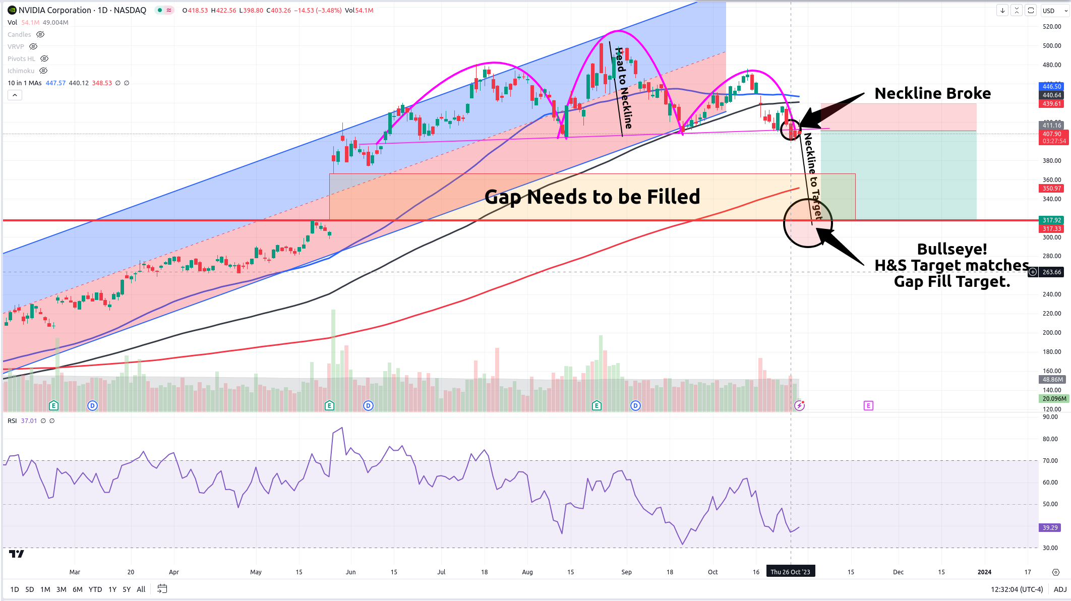 Couldn't help it. Far too enticing to ignore. NVDA price will be attracted to that $317 level like a super magnet. Not only do we have a H&S pattern now in play, but we have that huge gap to be filled. I mean, trades like these don't come around every day! It's a no-brainer here.