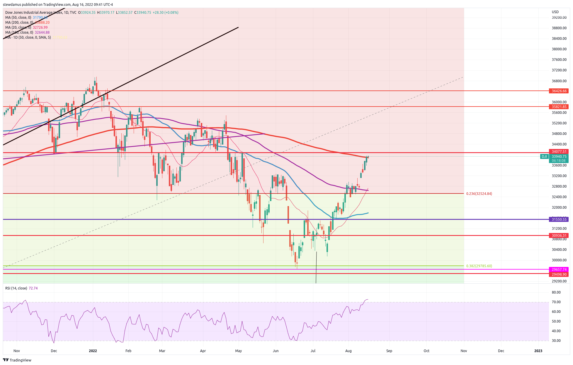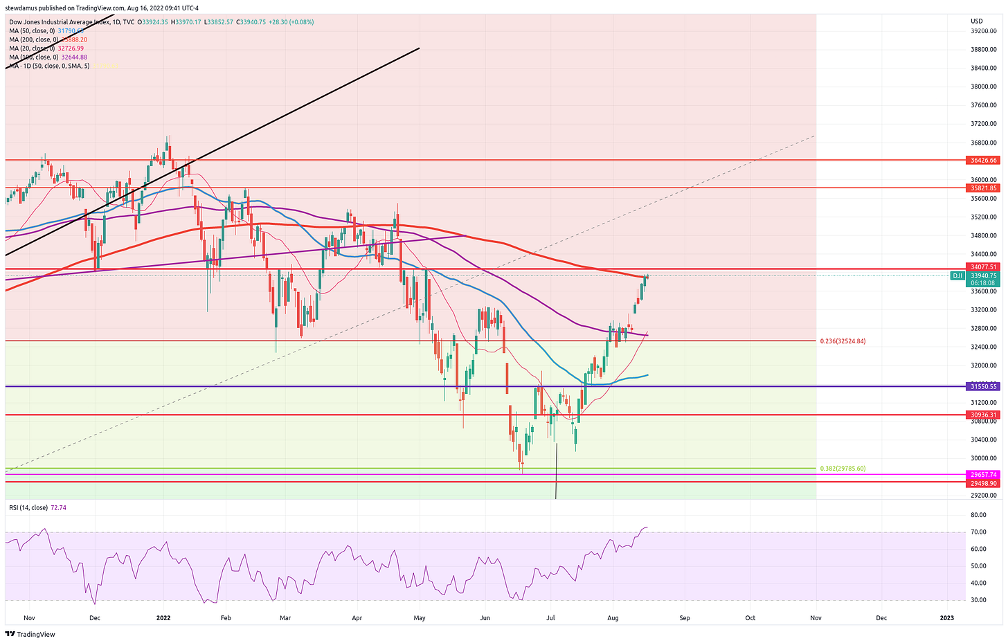 2. S&P and DOW nearing/hitting the 200 day ma along with the RSI in overbought territory. This in a bear market:
