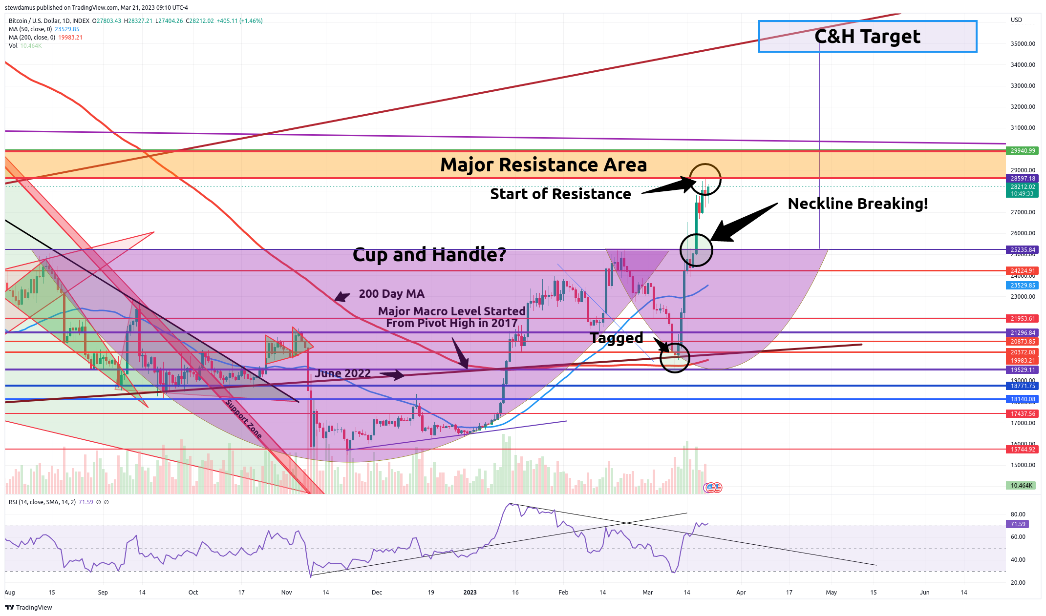 I’ve been in this BTC trade since 20k. It’s time to pull some profits. I’ve taken half off the top due to hitting our resistance area. I’ll wait for a pullback before re-entry and, as always, will notify you when I do re-enter.