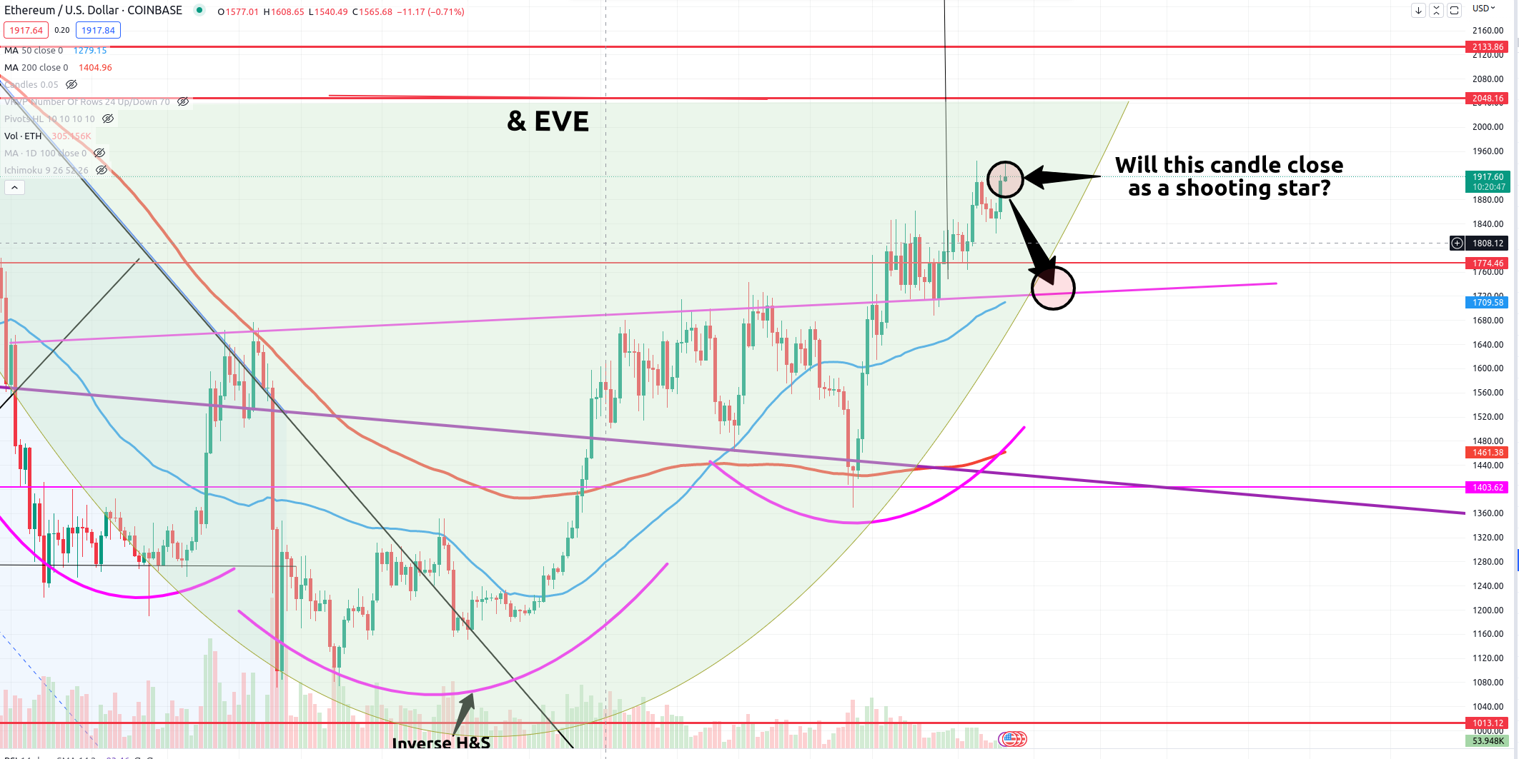 Admittedly, I may still be a bit skittish in this bear market. Maybe I am being too cautious? But with tomorrow's Shanghai upgrade on Ethereum happening tomorrow in which millions of Eth will be unlocked AND with this latest candle forming what could end up being a bearish shooting star, I am happy to take my profits here and wait it out.