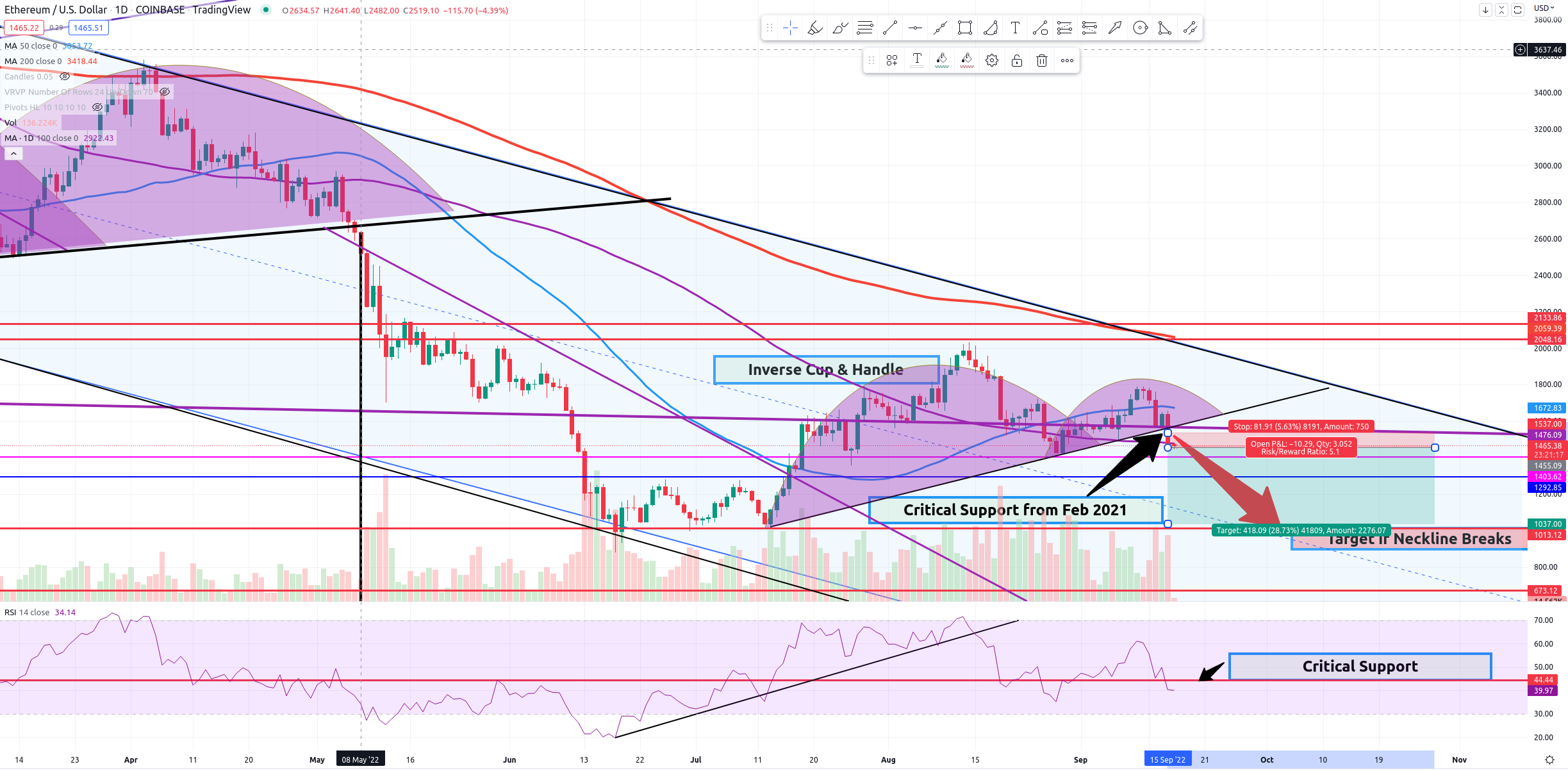 Above you can see an inverse Cup and Handle pattern I spotted on Ethereum a few days ago. Although, many state the market makers are manipulating prices and patterns aren’t working, I am going to give this one a try. The conspiracy theorist might be right and that is why I have put in a fairly tight stop here.