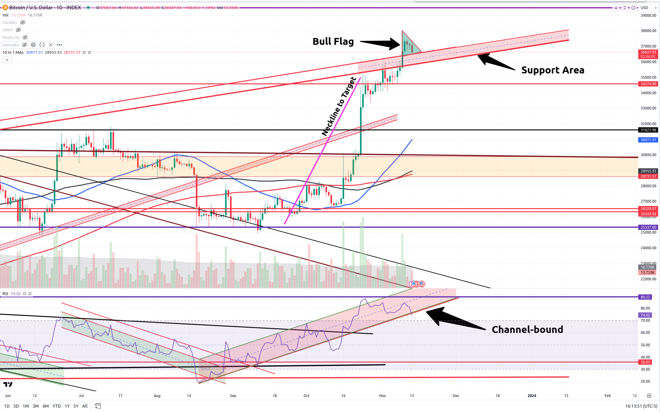 Daily RSI remains channel-bound. Will break sometime, but I don’t know that even if it breaks, we’ll get our 31,600 retest.