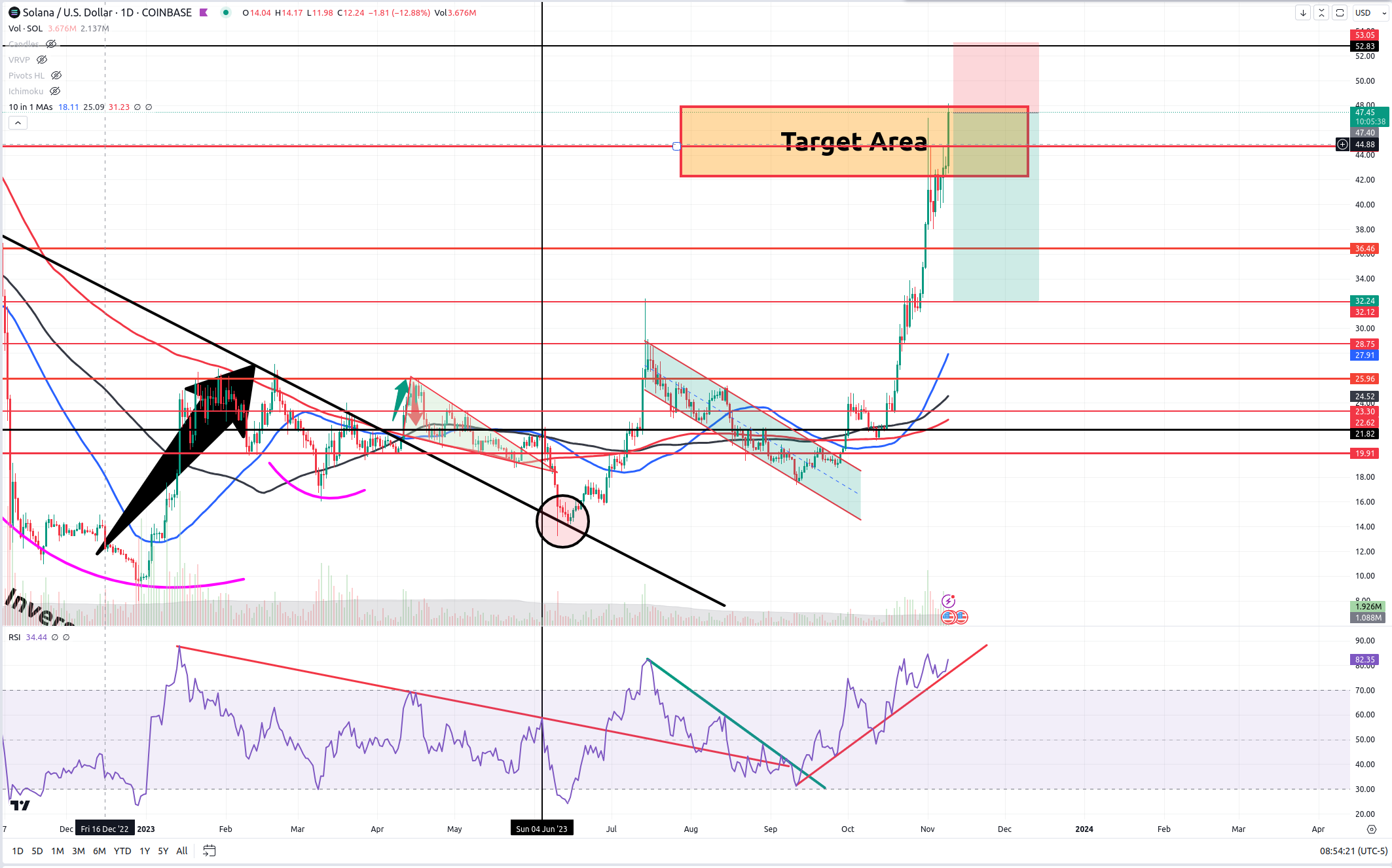 Solana has also reached its inverse H&S target. It also is following this news-driven pump along with FTX related items. And it also never dropped below over-bought territory on the daily RSI.