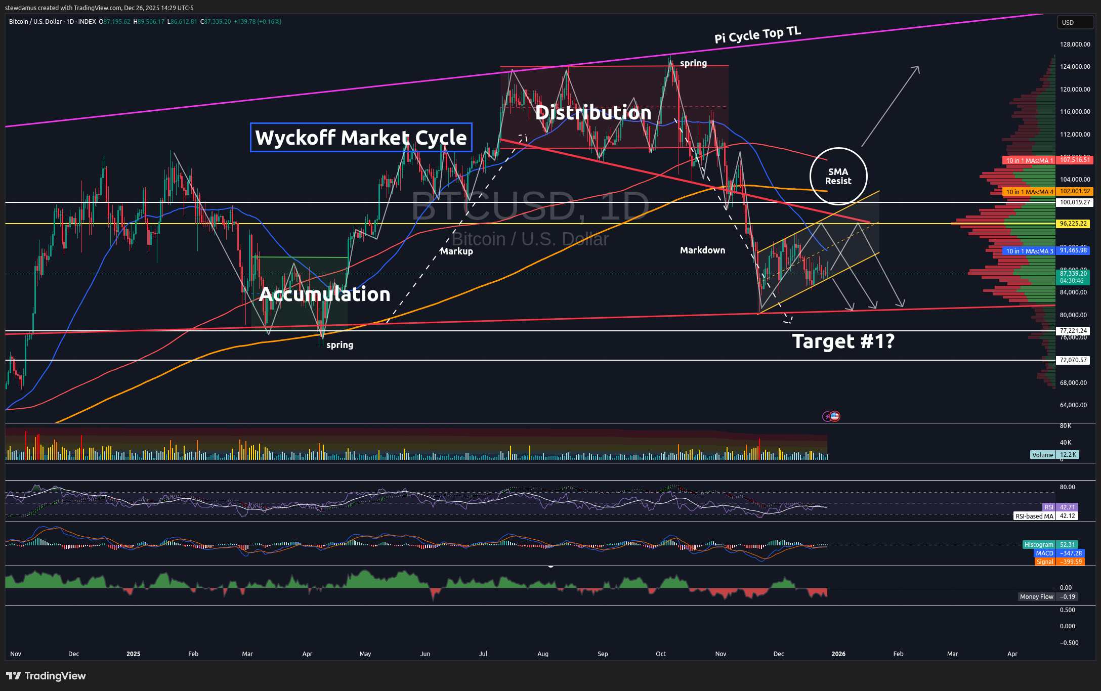 The only way we can count our Wyckoff Market Cycle as complete is if we happen to rally up above the top of our bear flag channel and break above the 350 SMA (orange) with confirmation. However, even that leaves some doubt. I’d prefer to see us break above that 200 SMA (red) and confirm to be more sure, otherwise, any rally may simply become a big old bull trap.
