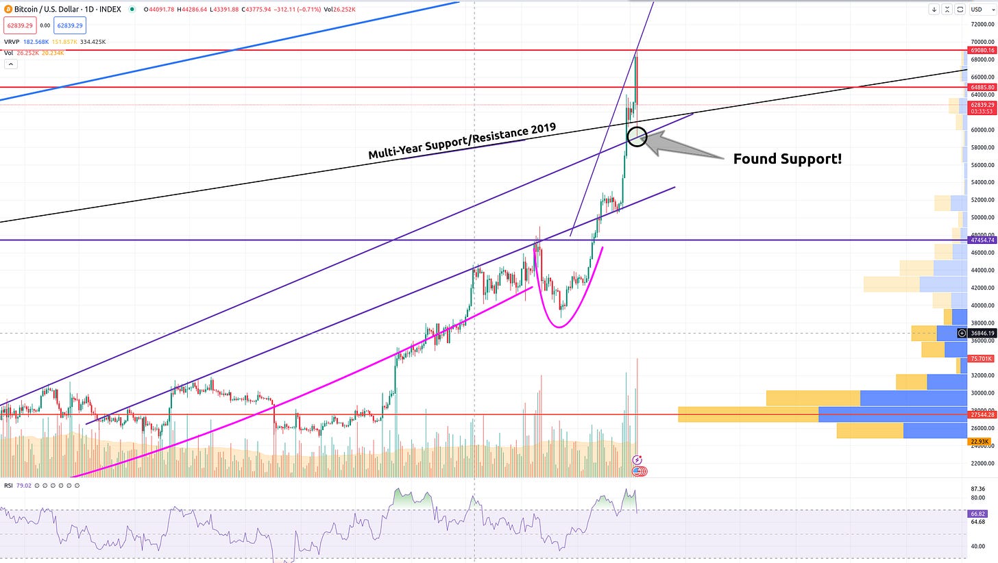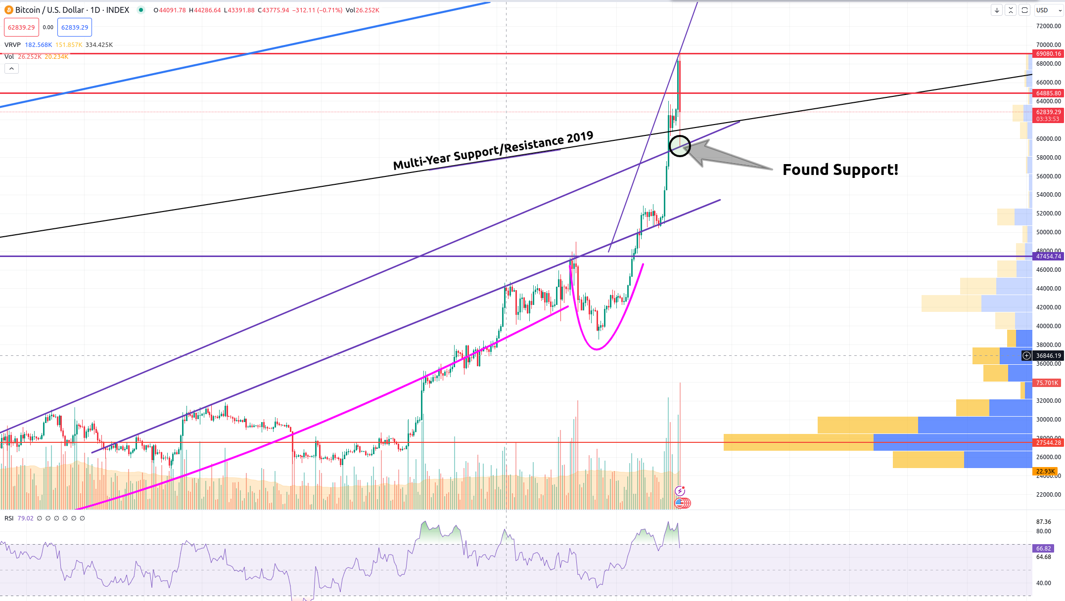 Despite this liquidation dump, I am still bullish Bitcoin. And when the dust settles today, I think we’ll see BTC back above our 64.8k support. And if not, then I do expect us to settle at least above my multi-year support/resistance line from 2019. Currently, that sits at around 61k. I am completely comfortable there. This dump was healthy and necessary, even if it is aggravating.
