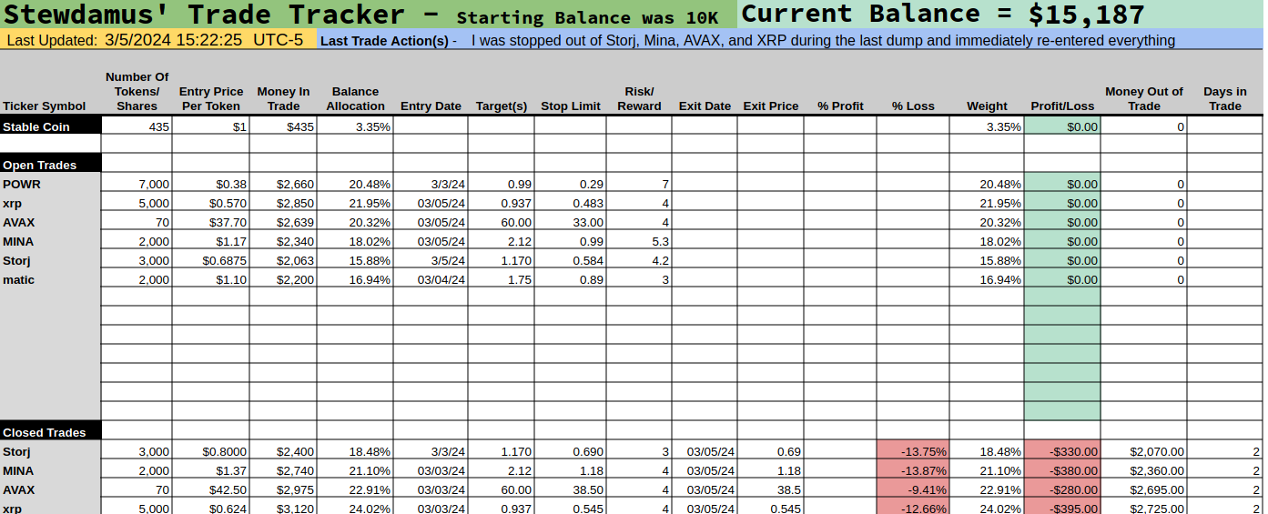 Needless to say, stops pulled me out of XRP, AVAX, MINA, and STORJ. But I immediately re-entered all of them.