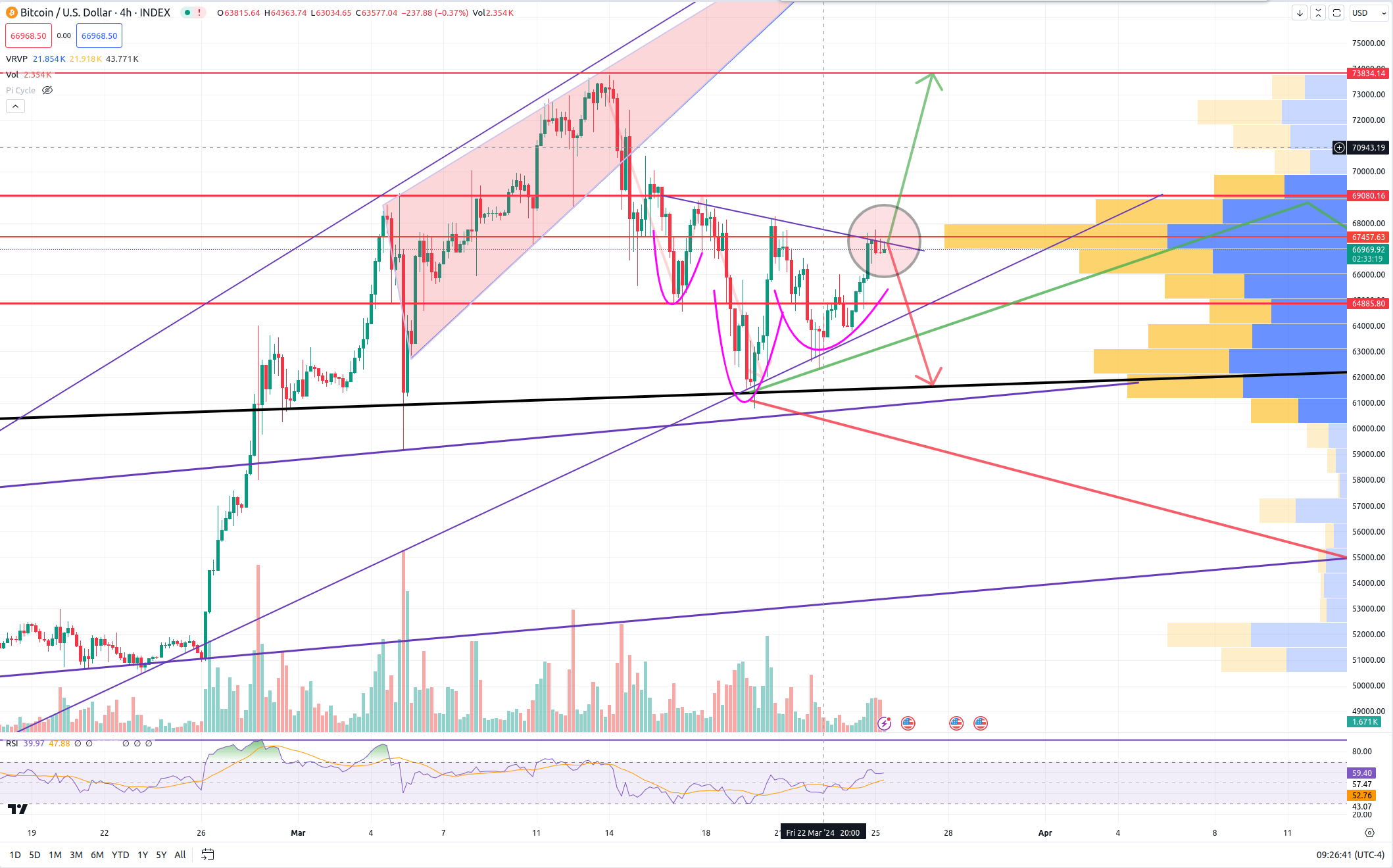 I've been reading that the second round of GBTC outflow, which contributed to the selling pressure recently, is drying up. This pattern on the 4 hour chart will either confirm or deny this rumor.