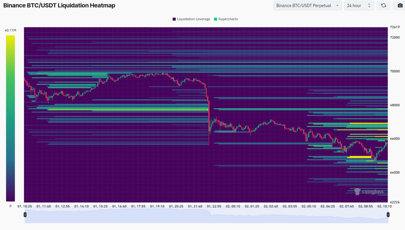A quick peek at our liquidation heatmap will show us that there are now a large amount of shorts around 67-68k. I could see us spiking up, liquidating these shorts, before further drop: