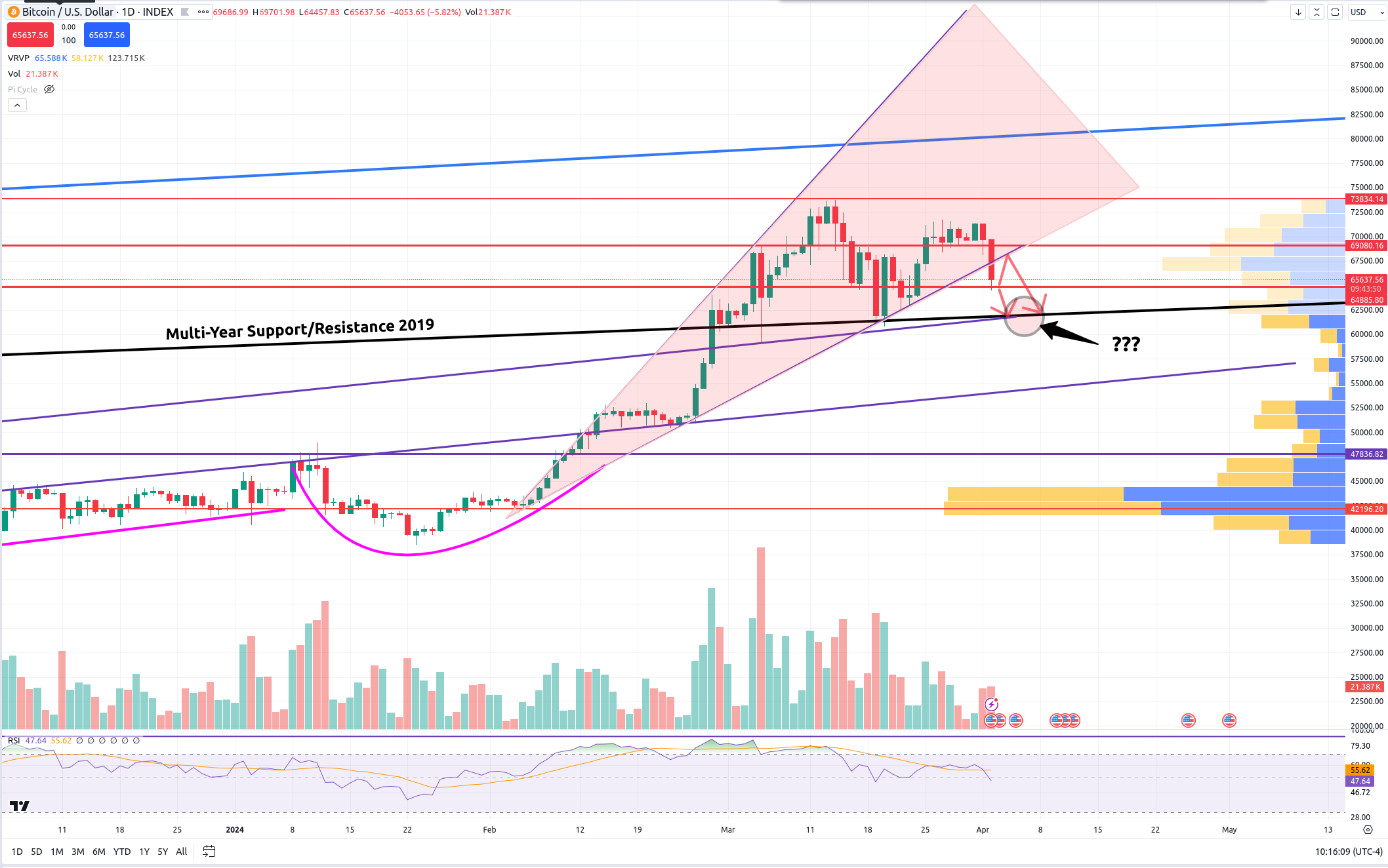 After this, I think we may retest our multi-year support (again) which now sits at around 62k. Then, the question becomes whether or not it holds. Since this is the third time we will have retested it after crossing above, I am honestly not as confident it will hold support. Remember, at each retest, the support gets weaker. That said, I may still enter a small long here with tight stops. Below this you can see support at around 54-55k (purple line). And below that? That 48k neckline which I have been discussing for months now. I would absolutely love to scoop up some BTC at that price!