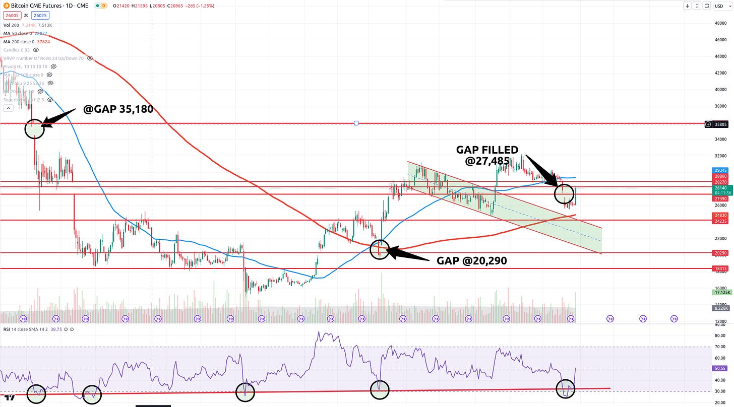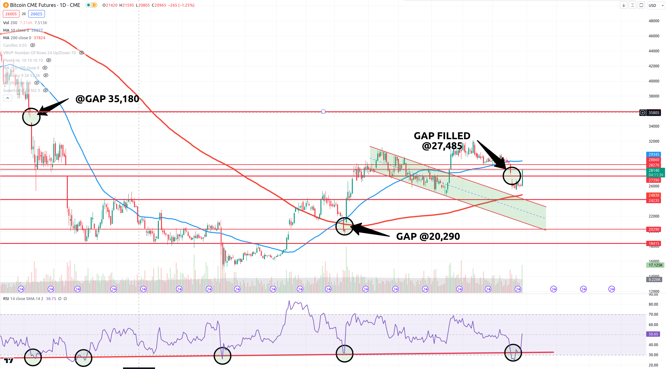 A few posts ago, you will see that (2) two gaps were being focused on. The question was posed about which might be filled first. Many of my followers understand that my bias was to the upside gap being filled first. Thanks to the Blackrock ETF approval, this has occurred. And, as I stated in my video yesterday, I have unloaded 50% of ALL my positions (alts included), taken profits, and moved my stops up to break even. I will let the remainder ride for now and hopefully take the rest off at the 50 day ma of the SPOT BTC chart which intersect exactly with the bottom of that important support (now resistance) which I talked about in yesterday's video at 28,750. If we don't hit that and I get stopped out instead, no issue cuz I move all my stops to break even and will take no loss now.