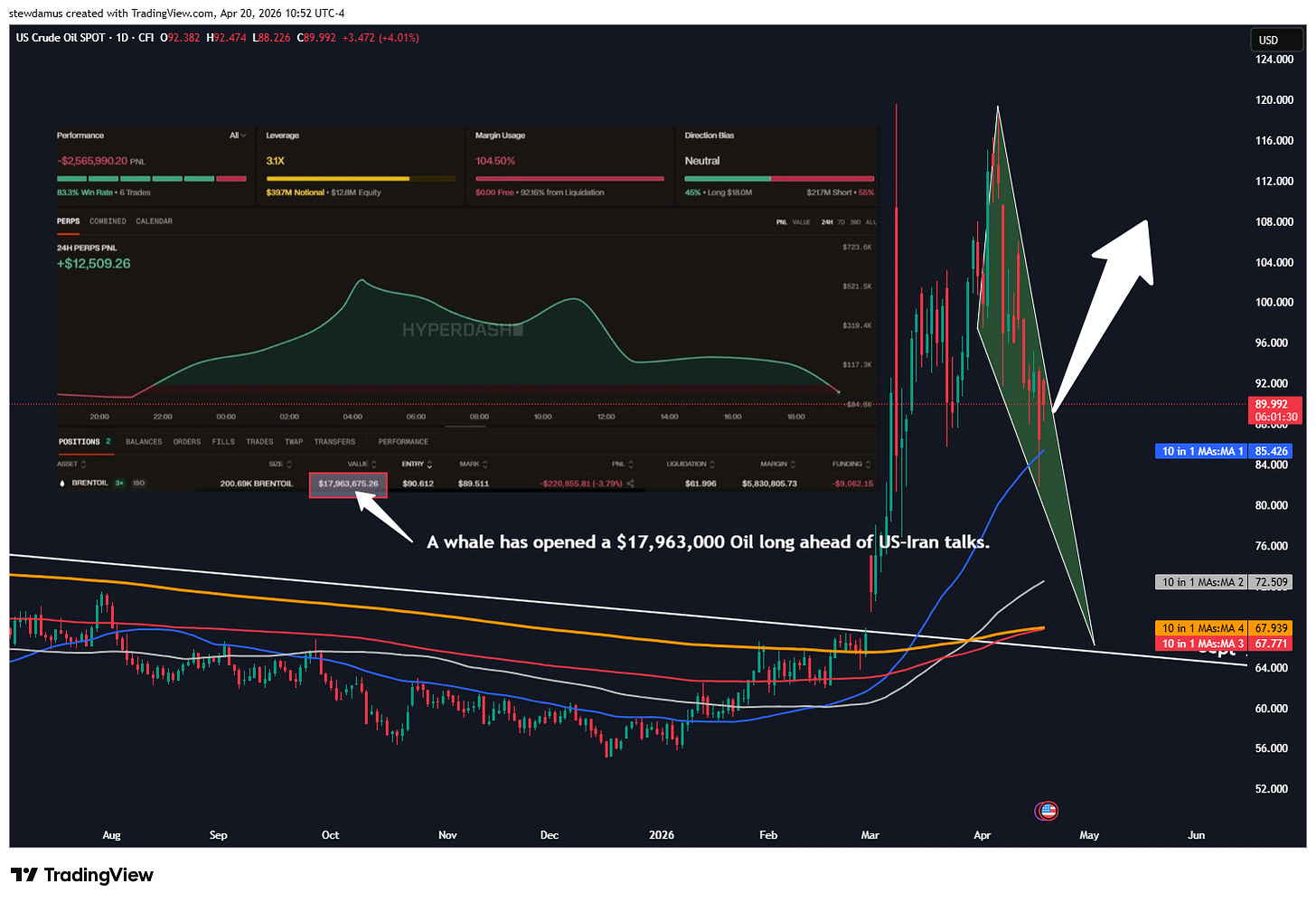 I have posted yet another example of a huge whale here opening a nearly 18 million dollar long on oil ahead of supposed U.S.-Iran talks. Does this whale know something the average retail trader does not? 18 million dollars screams, “YES”!