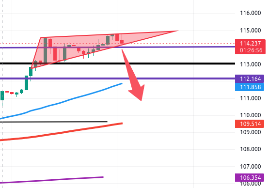 You can see here we are testing that long-standing ascending trend-line (currently working as resistance) since 2009. I did NOT (and still don’t) expect us to break right through. In fact, the 4 hour is showing a bearish ascending wedge (below):