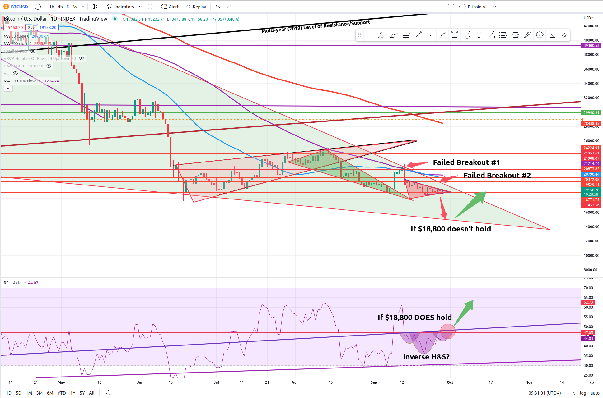 After failing twice to break to the topside of our long-standing bullish descending wedge (since November 2021), #BTC has retraced back down to our super strong support at $18,800. Should this break, look for us to retest our previous low and/or the bottom of our triangle which currently sits at around 15k. We could see prices anywhere from 14k-16k tested with a break of that 18.8k support. Watch this closely.