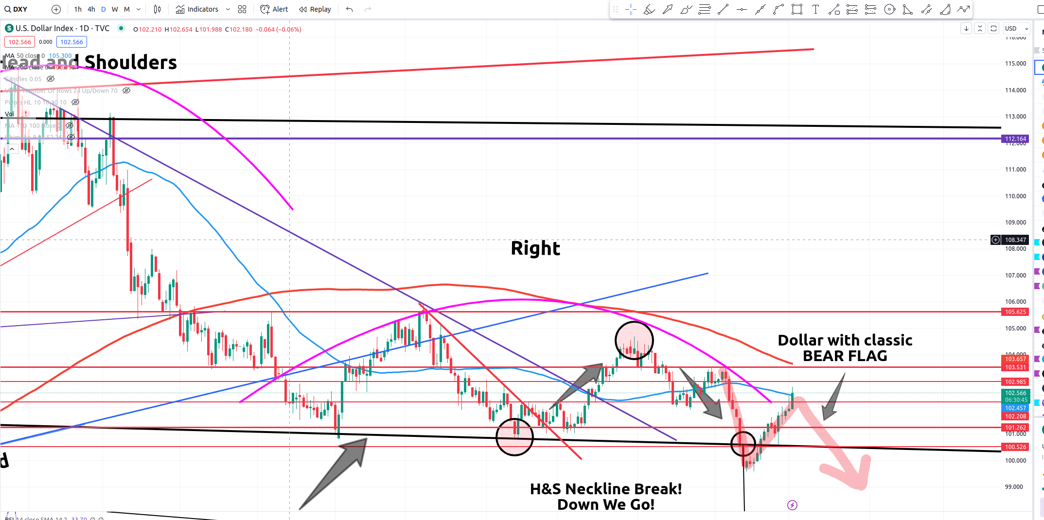 What would invalidate my H&S pattern? Well, if the dollar beats that 50-day moving average and then proceeds to move up and above that 103.53 level with confirmation, I might be wrong and would have to re-evaluate at that point. Until this time, the DXY has formed a classic bear flag and I expect weakness to continue. The weaker the dollar, the more dollars it takes to buy a thing. The more dollars it takes to buy a thing, the higher the prices will go to reflect what is needed. This includes stocks.