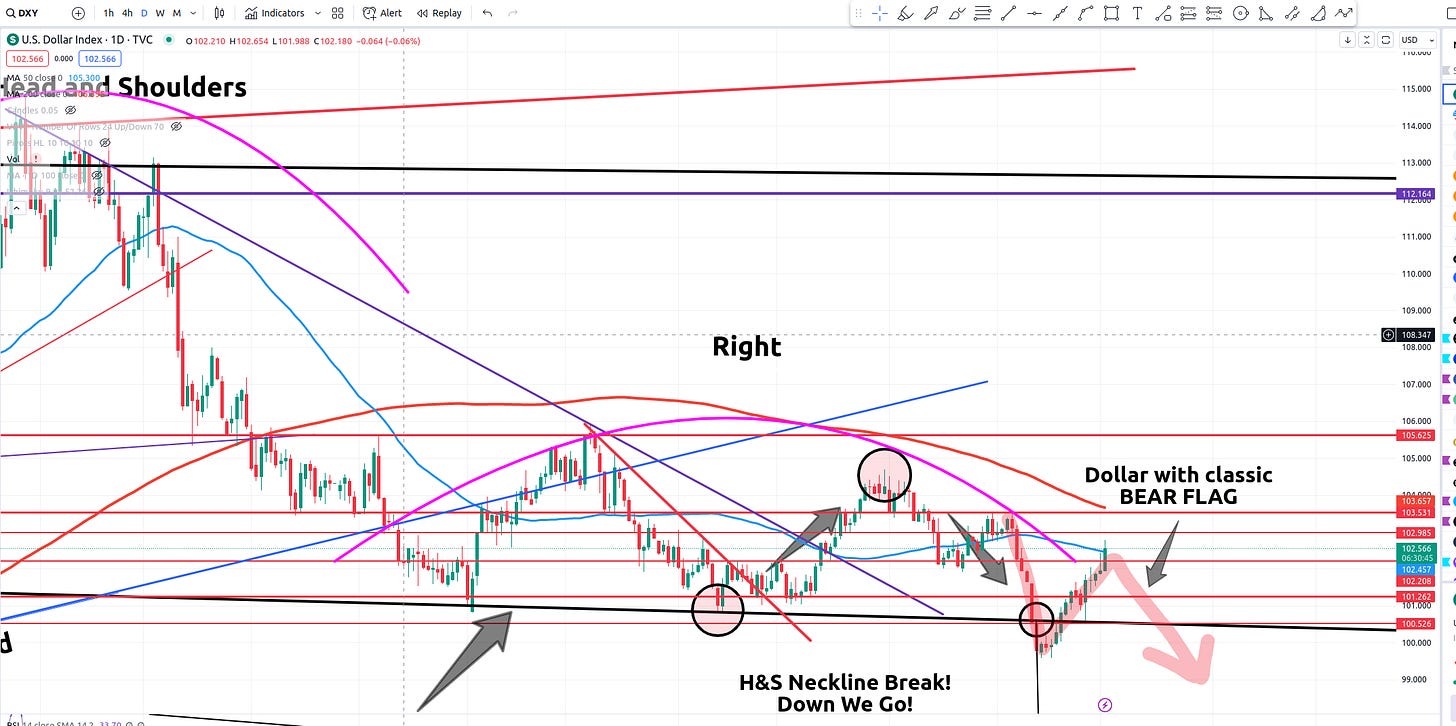 It's not like the dollar has turned the corner here and growing stronger. We are still very much in a downtrend. Even that right shoulder is still valid. And, like I said, on a weekly chart that neckline still holds. Once broken, the dollar is in trouble.