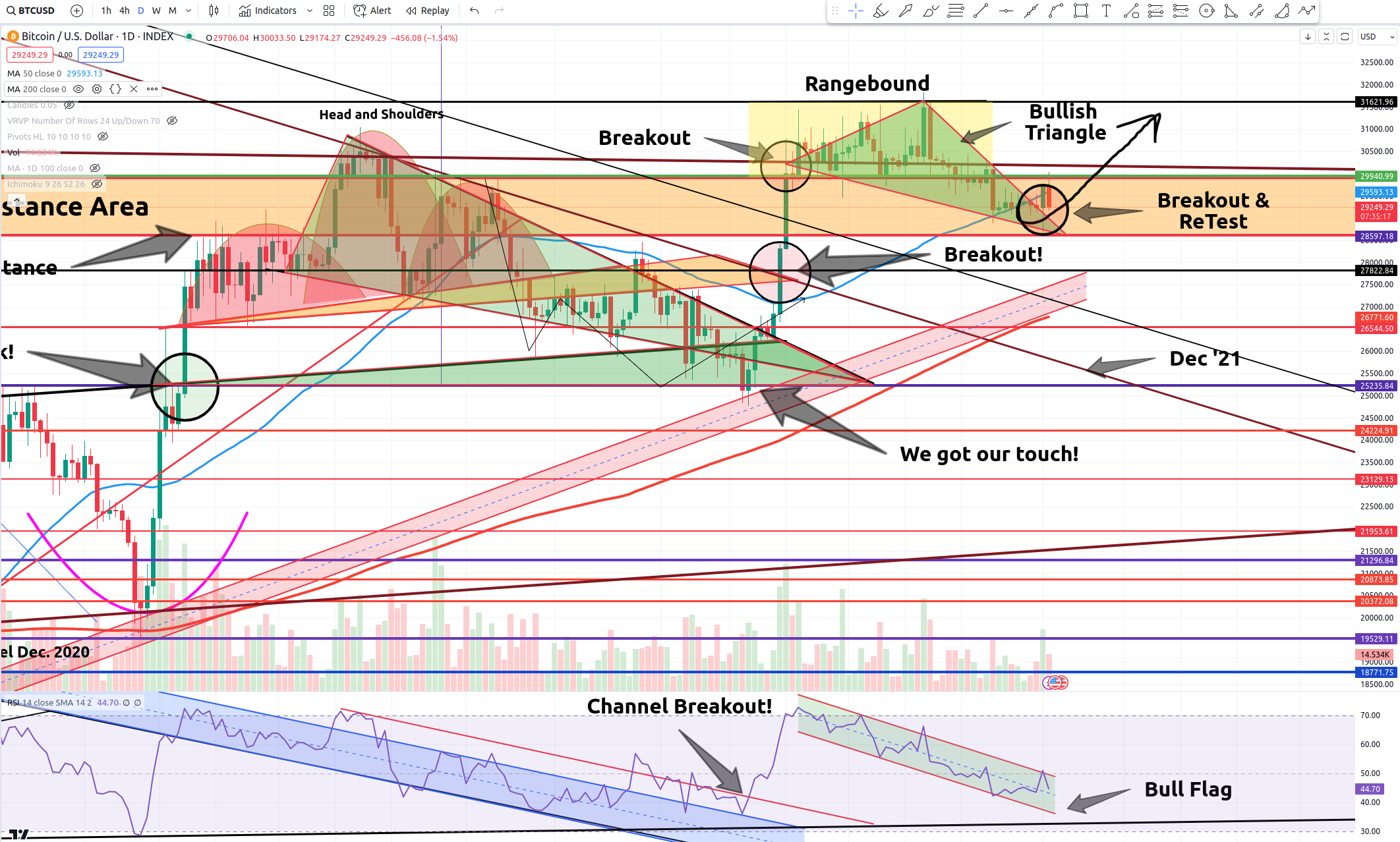 Bitcoin is pulling back with the markets to test the topside of previous resistance as support. If it holds, we'll continue up. If support fails and we drop below 28,500 ish, I will have to reassess the chart.