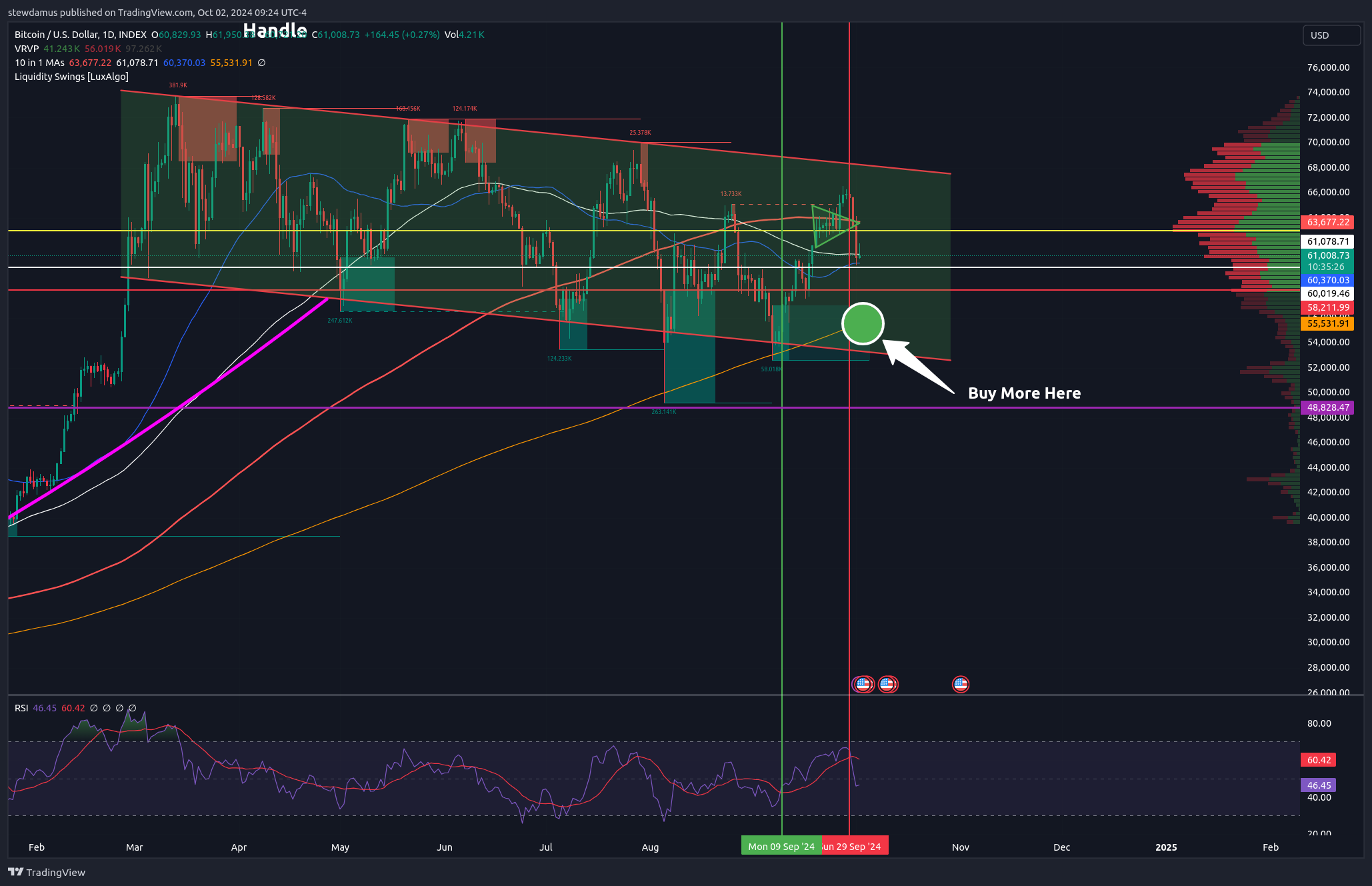 The new indicator combo is a clear RED now with plenty of confirmation. After taking half of my profit at around 64k, I set my stops on BTC at just above break-even. I could hodl the rest of my position through, but in sticking to my new trade strategy I won't do that. Instead, I'll sell when my stops are triggered for slightly above break-even, and then I will look to re-enter when my indicator combo triggers GREEN. I am expecting the signal to turn green again somewhere in that liquidity block just above that orange 350 DMA.