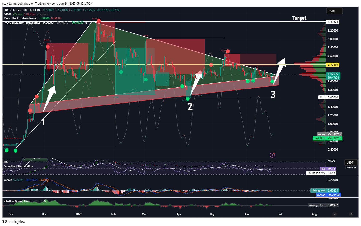 It's really this simple. This is a bullish triangle. Three hits in the premium buy zone (bottom of the triangle) and we're done. Once we break, there will be some resistance at that VRVP PoC (2.39), and then we're gone. 3.40 is an easy target.
